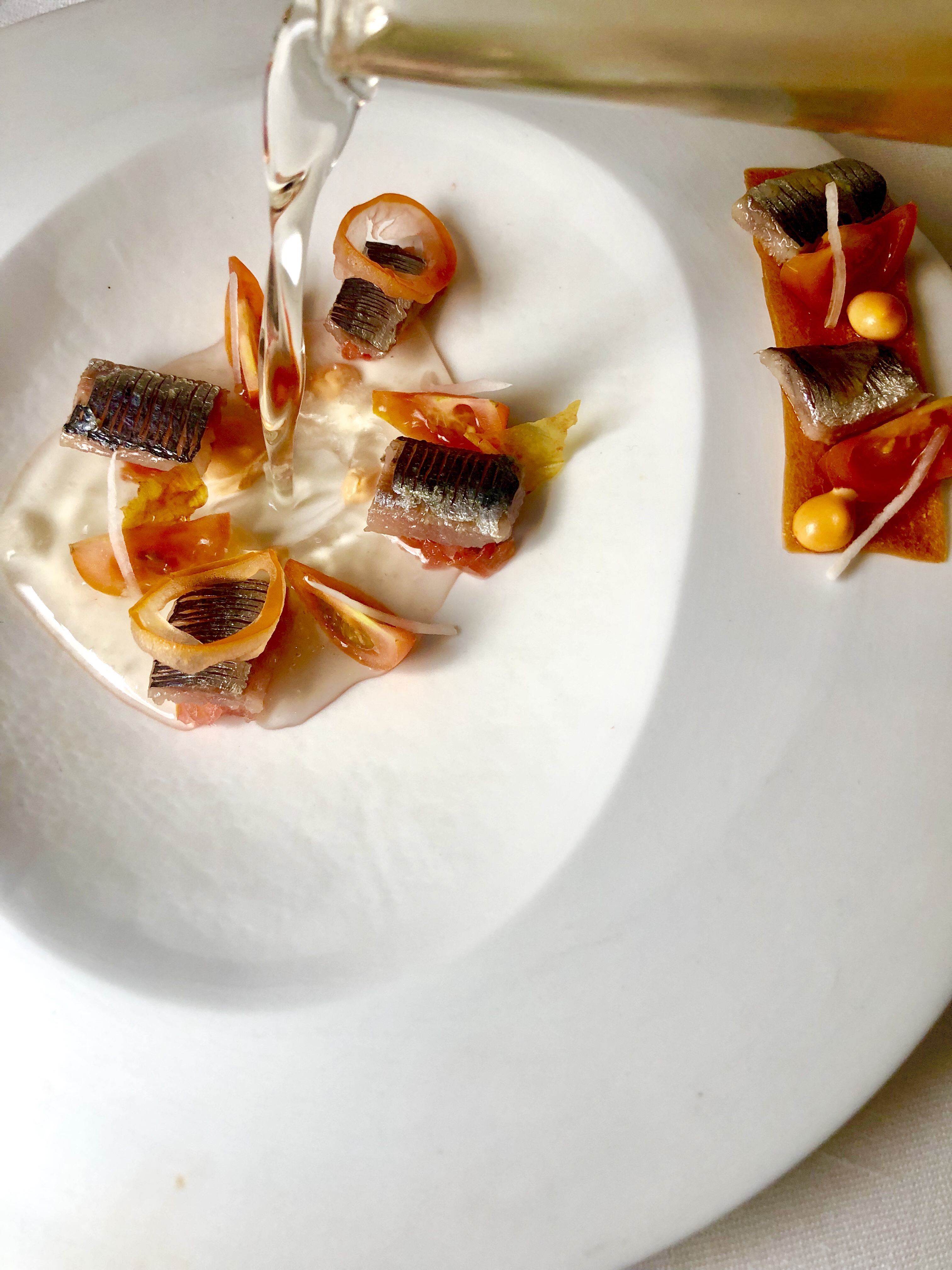Ya había probado este maravilloso y bellísimo plato, una mezcla de huerto devastado y de fondo marino pasado por Marte. Ahora aciertan sirviéndolo con un gran moscatel malagueño. Tomates marinados, alga codium y lo verdaderamente grande: gárum, la maravillosa salsa de pescado romana que se importaba desde España y que aquí se convierte en polvo helado. Mucha huerta y mucho dulzor de tomate, mucha sal de mar y mucho pescado que no se ve porque está todo en la salsa. Muy brillante en todos los sentidos.