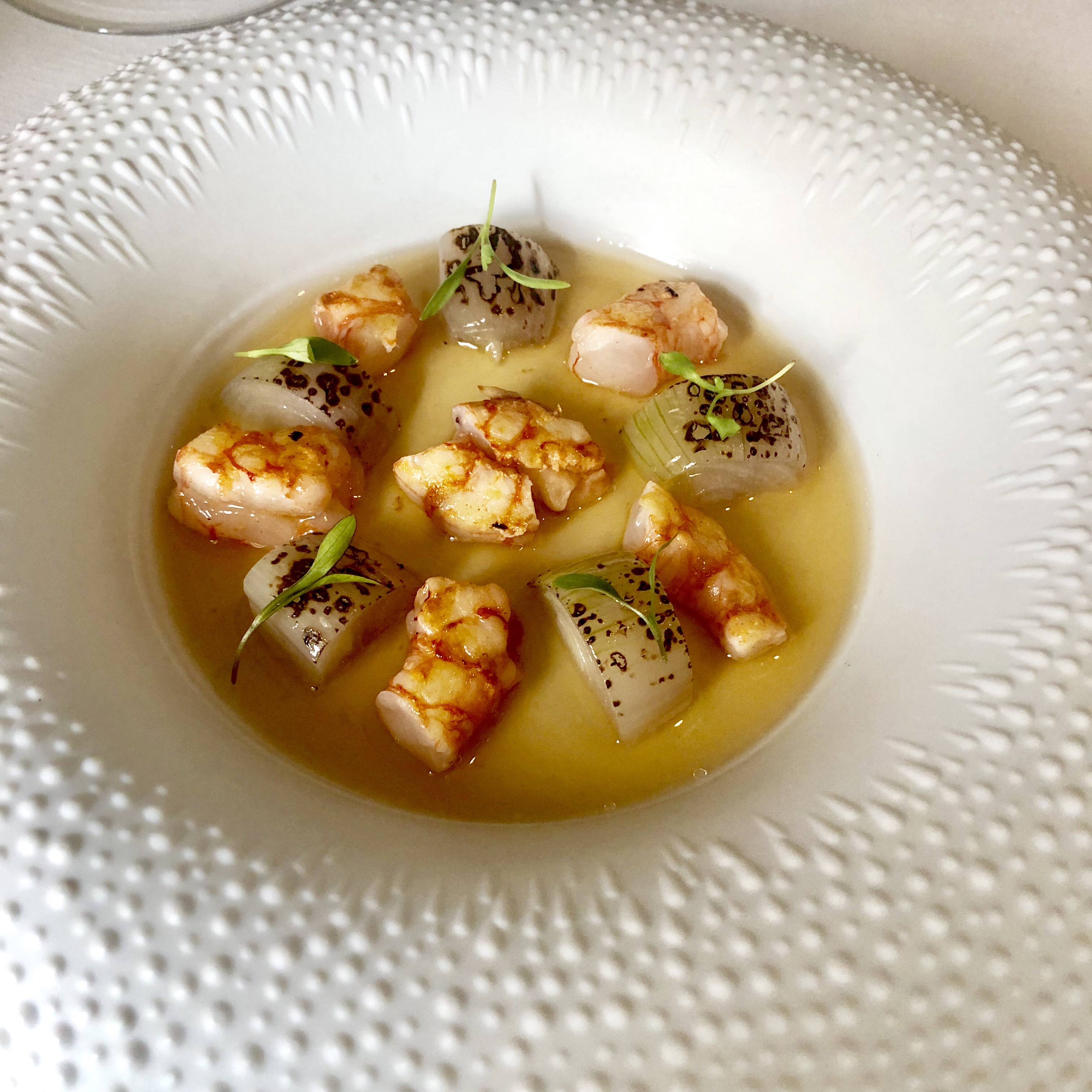 Muy elegante y equilibrado, además de sencillo, es el plato de las gambas rojas. Junto a ellas, tan solo unas dulces chalotas de primavera y el intenso y bien clarificado jugo de las cabezas de las gambas.