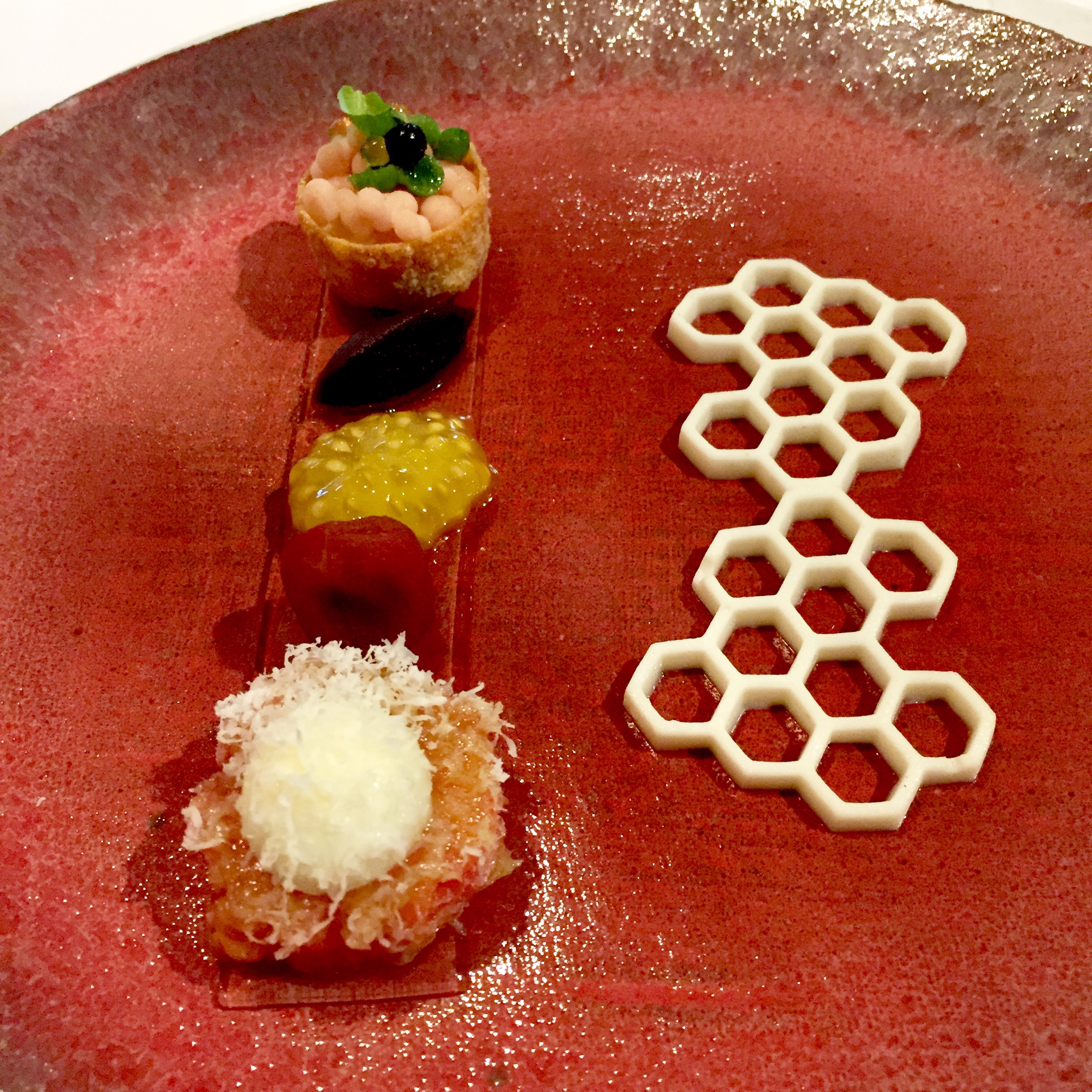 He respetado todos los nombres que pone el chef a los paltos. Hasta ahora son más o menos sencillos culminando con la simplicidad de El estudio del tomate 2019, pero no se confíen. Verán a partir de ahora… En cuanto al plato es excelente. El tomate en tres texturas diferentes y con acompañamientos que van desde el queso a una tartaleta muy fina, pasando por un bello encaje geométrico de ADN realizado con una densa y sabrosa crema de ajoblanco. Así que, verano en vena.
