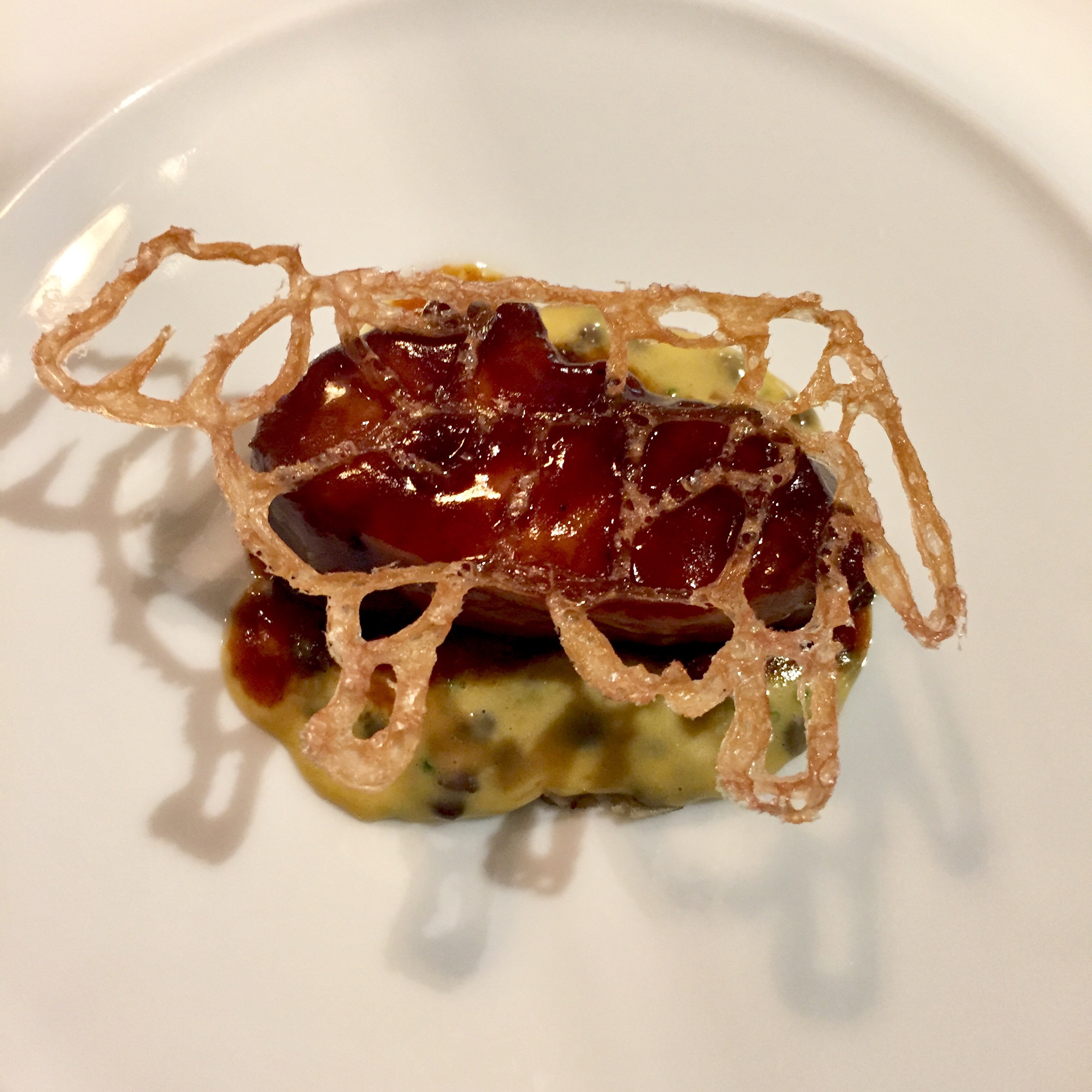 Y llegamos a una locura total que no nos dicen que es. Parece carne bajo la salsa, al cortarla sardina y nada de eso es, sino piel de pescado y toffe de atún, o sea una brillante piel de bacalao que envuelve un atún glaseado en salsa de toffe, alga nori y daikon (un rábano picante del sudeste asiático). Aquí vamos al revés, de la simplicidad al barroquismo total.