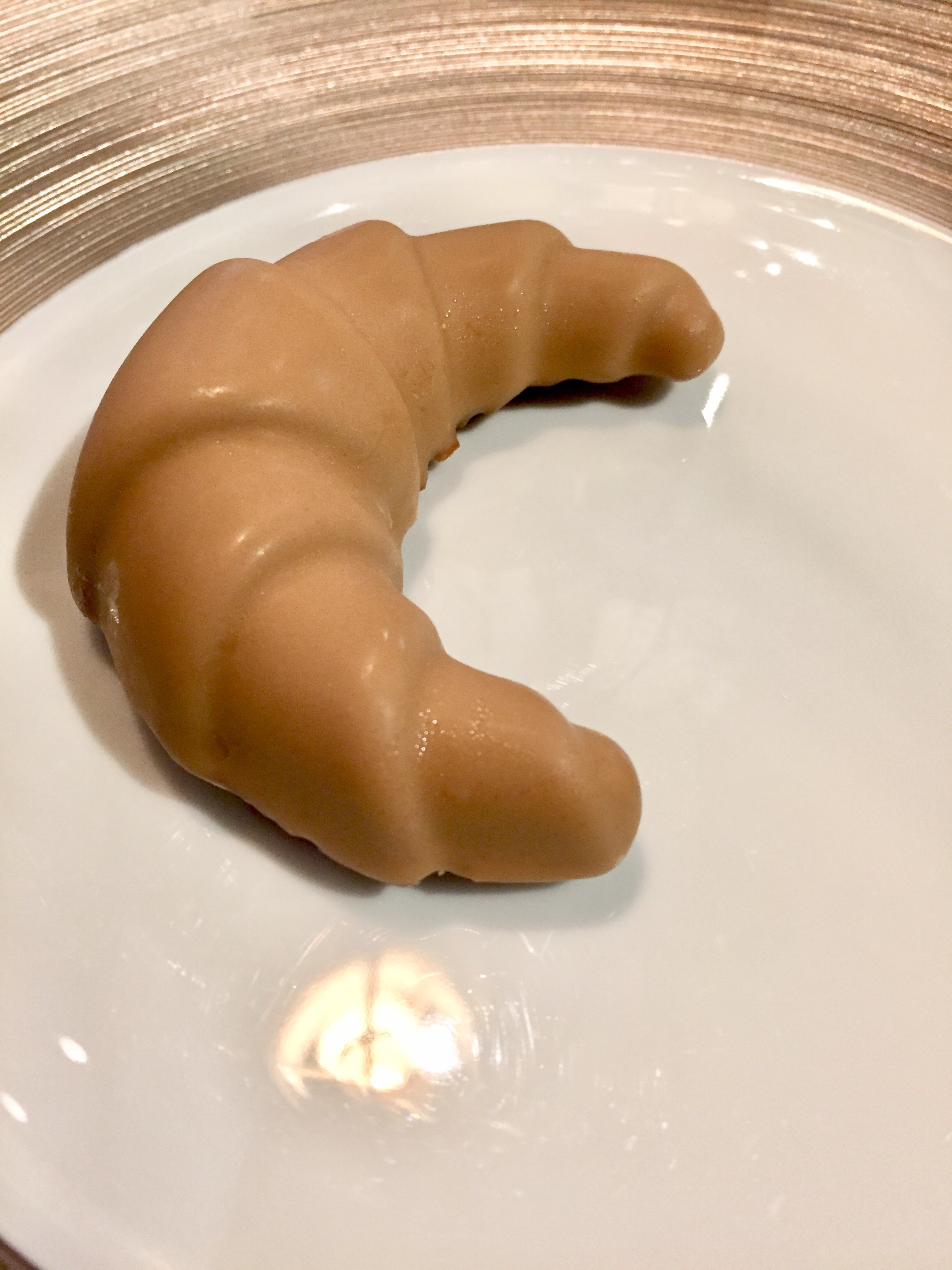 Y un final a la altura: Nuestra versión del croissant de chocolate, un auténtico bombón de chocolate blanco que es un gran trampantojo relleno de muy buenos chocolates negros.
