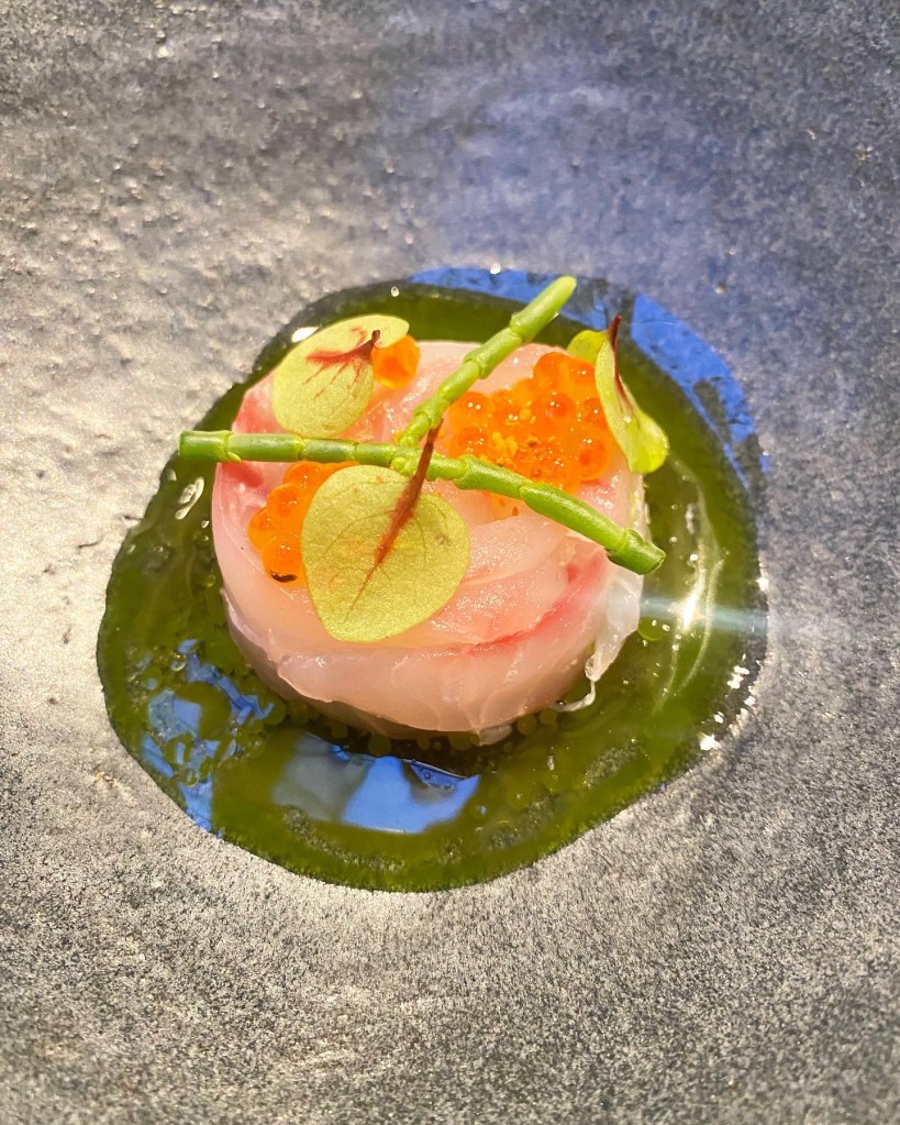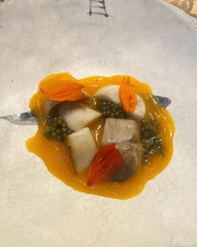 Antes de la llegada del primer plato a la mesa, nos sirven una copa de oporto Noval blanco, macerado con hoja de ostra. Todo un hallazgo de este gran sumiller que sirve para acompañar con toques marinos a un sorprendente carabinero. Otro plato con un solo producto y que consiste en una untuosa crema que es una mantequilla elaborada con la carne del crustáceo y una costra realizada con las patas y los bigotes fritos. El sabor es un poco bestia y los labios me picaron durante un rato, pero esta no es una cocina para timoratos. Se usan sabores fuertes y se busca intensificarlos de muchas formas inteligentes y habilidosas.