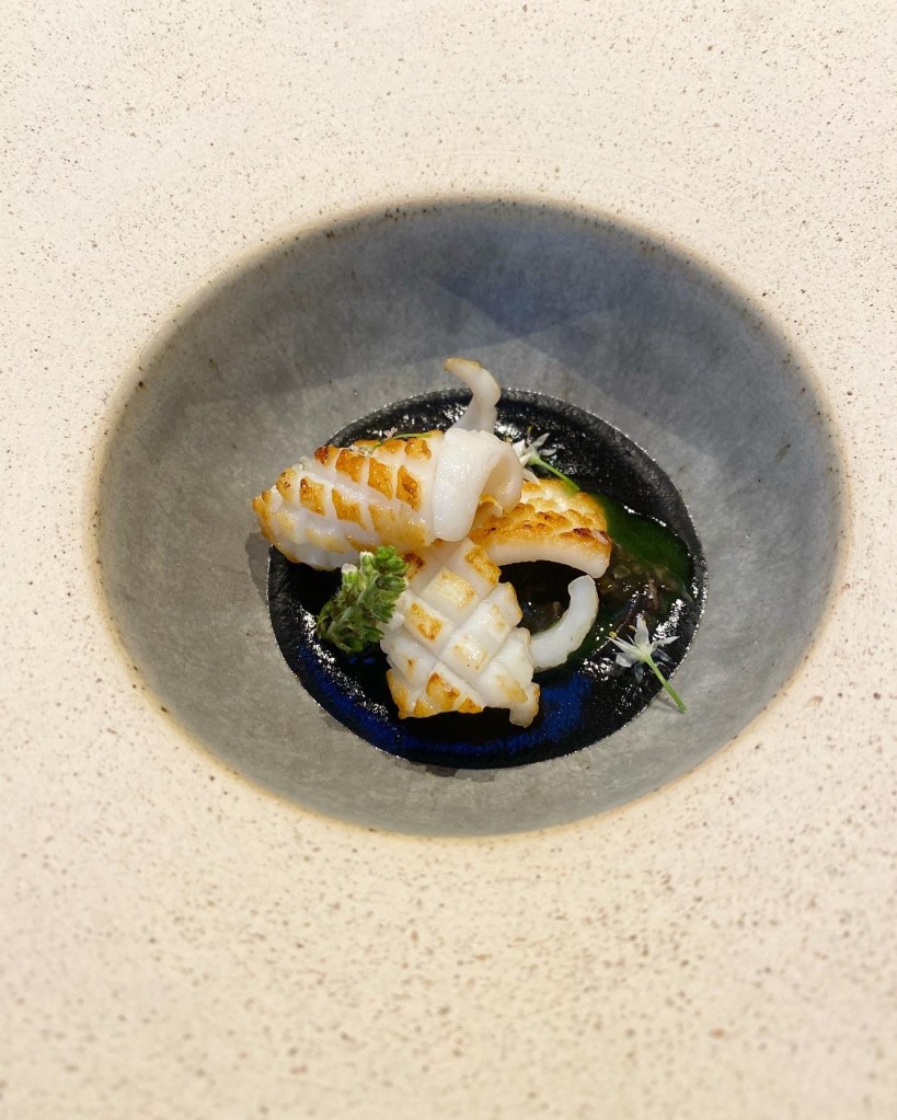 Hay mucha investigación y rigor en esta cocina. Hace tiempo empezó a estudiar las salsas hechas a base de la proteína del ingrediente principal y así empezamos ahora, en el bar, con un calamar a la romana absolutamente brillante. No tiene pizca de harina y sin embargo es un buñuelo. Se hace solo con la proteína del calamar y es una explosión de sabor. Fresco, ligero, etéreo. Se moja -y casi se deshace- en un pil pil del calamar que completa el sabor a puro calamar concentrado.