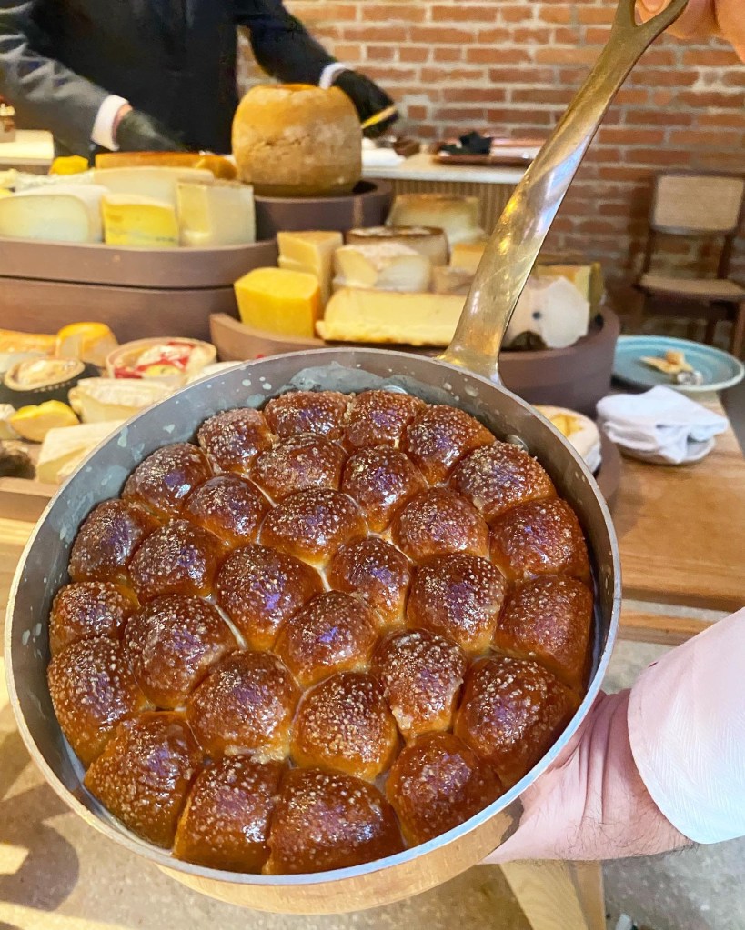 Llega también el estupendo pan templado (sobre piedras calientes) acompañado del excelente aceite de la casa y una maravillosa mantequilla Echire. Ha mejorado mucho con la nueva presentación porque antes se ponía en unos cuenquitos del tamaño de un dedal, muy monos, pero con los que había que pelearse.